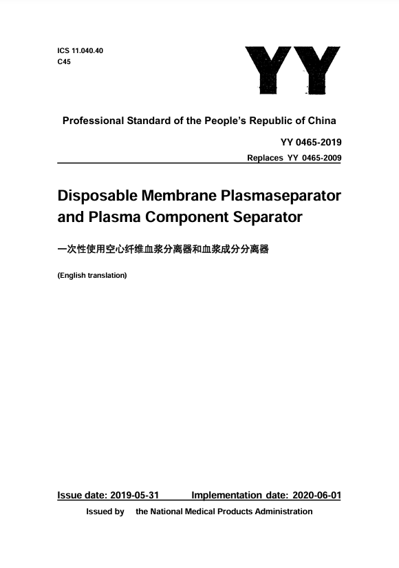 YY 0465-2019ValidDisposable membrane plasma separator and plasma component separator